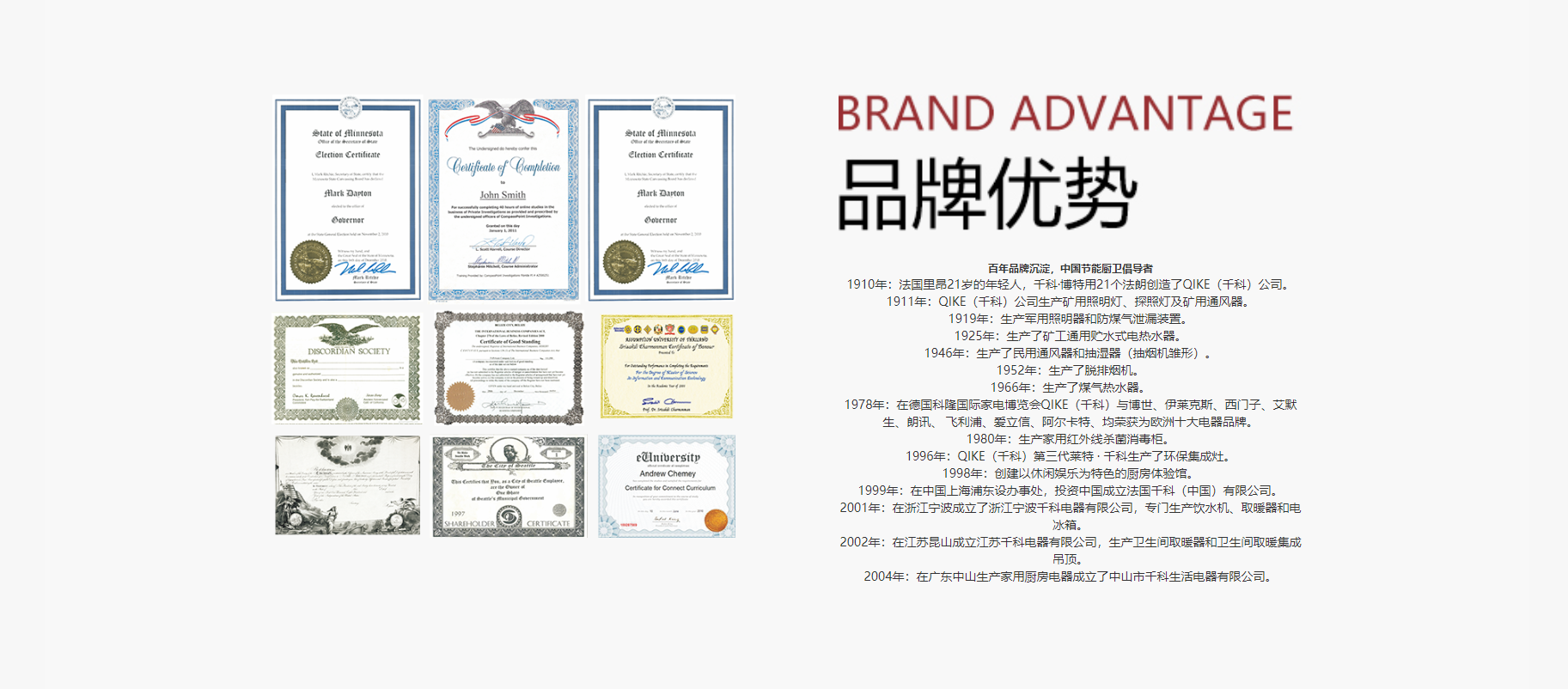 1978年:在德國科隆國際家電博覽會QIKE(千科)與博世、伊萊克斯、西門子、艾默生、朗訊、飛利浦、愛立信、阿爾卡特、均榮獲為歐洲十大電器品牌。