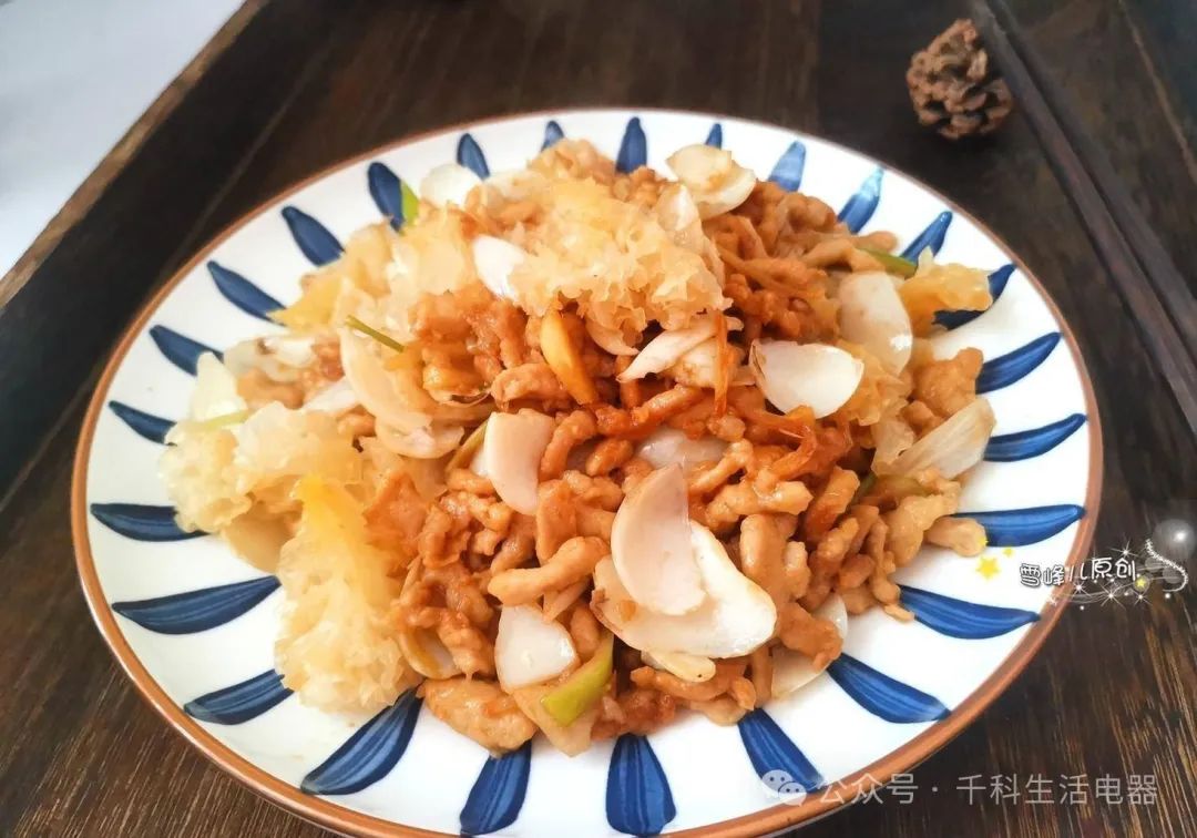 3、倒入銀耳和百合,繼續翻炒均勻,加鹽調味,即可上桌。
